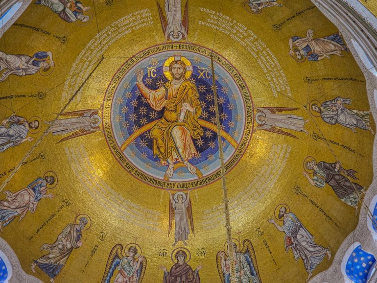 Наиме, у свету постоји само једна византијска купола у мозаику у Цркви Светог Марка у Венецији која је послужила као инспирација Мухину који је дао свој уметнички допринос приликом прераде и направио јединствени бленд византијске, руске, и балканске средњовековне традиције у једно. Дело је благословено од стране патријарха Иринеја који је поставио први комад смелта у мозаик куполе 2016. године када је званично почело декорисање Храма.