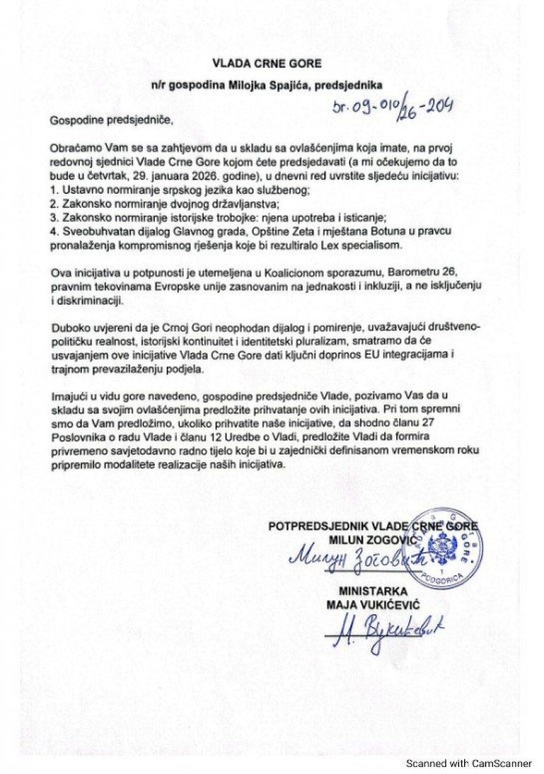 У званичном допису упућеном премијеру Милојку Спајићу, потпредседник Владе Милун Зоговић и министарка Маја Вукићевић траже да се на прву наредну седницу Владе уврсти пакет иницијатива од кључног националног значаја.