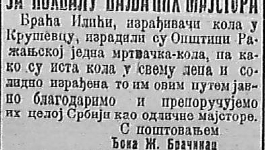 -Браћа Илићи,израђивачи кола у Крушевцу,израдили су Општини Ражањској једна мртвачка кола, па како су иста кола у свему лепа и солидно израђена то им овим путем јавно благодаримо и препоручујемо их целој Србији као одличне мајсторе, с поштовањем Ђока Ж. Брачинац, председник општине и народни посланик са грађанима варошице Ражња-објављено је у „Малом журналу“ пре 111 година.