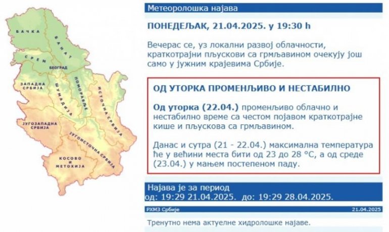 Данашња нестабилност увод је у јачу промен у времена од сутра, а која ће у наставку седмице донети Србији врло нестабилно време повремено са пљусковима и грмљавином. Биће услова и за олује са грмљавином.