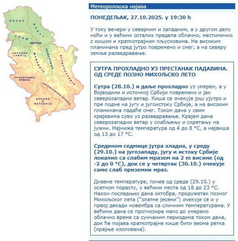 Сутра (28.10.) и даље прохладно уз умерен, а у Војводини и источној Србији повремено и јак северозападни ветар. Киша се очекује још ујутро и пре подне на југу и југоистоку Србије, а на високим планинама падаће снег. Током дана у свим крајевима суво уз разведравање. Крајем дана северозападни ветар у слабљењу и скретању на јужни. Најнижа температура од 4 до 8 °С, а највиша од 13 до 17 °С.