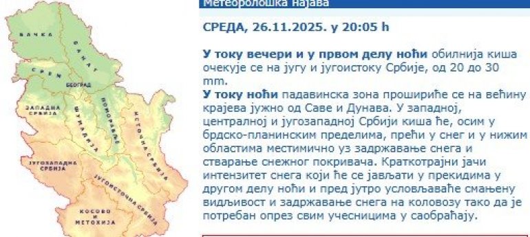 У току ноћи падавинска зона прошириће се на већину крајева јужно од Саве и Дунава. У западној, централној и југозападној Србији киша ће, осим у брдско-планинским пределима, прећи у снег и у нижим областима местимично уз задржавање снега и стварање снежног покривача. Краткотрајни јачи интензитет снега који ће се јављати у прекидима у другом делу ноћи и пред јутро условљаваће смањену видљивост и задржавање снега на коловозу тако да је потребан опрез свим учесницима у саобраћају.