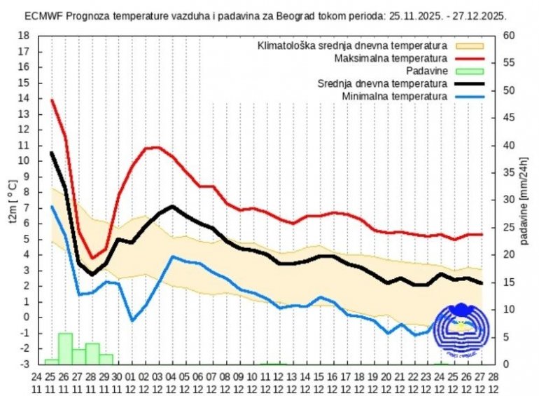Од 8. до 14. децембра, средња температура ће бити у границама вишегодишњег просека у већем делу Србије, осим у источној и југоисточној Србији где се очекује да буде изнад вишегодишњег просека.