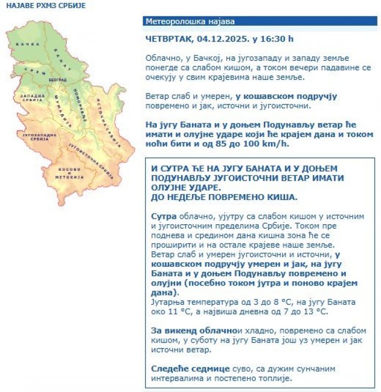 РЕПУБЛИЧКИ хидрометеоролошки завод огласио се на свом званичном сајту најновијим саопштењем.