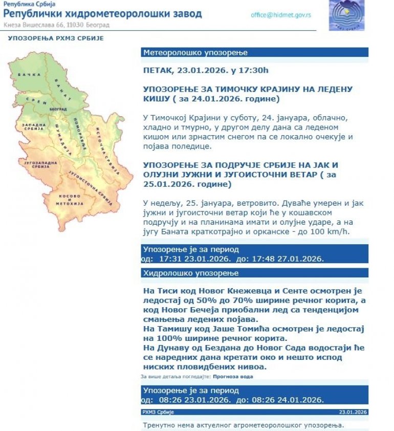 Републички хидрометеоролошки завод (РХМЗ) издао је претходно хидролошко упозорење да је на рекама Тамиш и Тиса осмотрен ледостај, а Јавно водопривредно предузеће "Србијаводе" саопштило је данас да је водостај Велике Мораве у порасту, водостај Тисе у стагнацији, а водостаји Саве и Дунава у опадању.