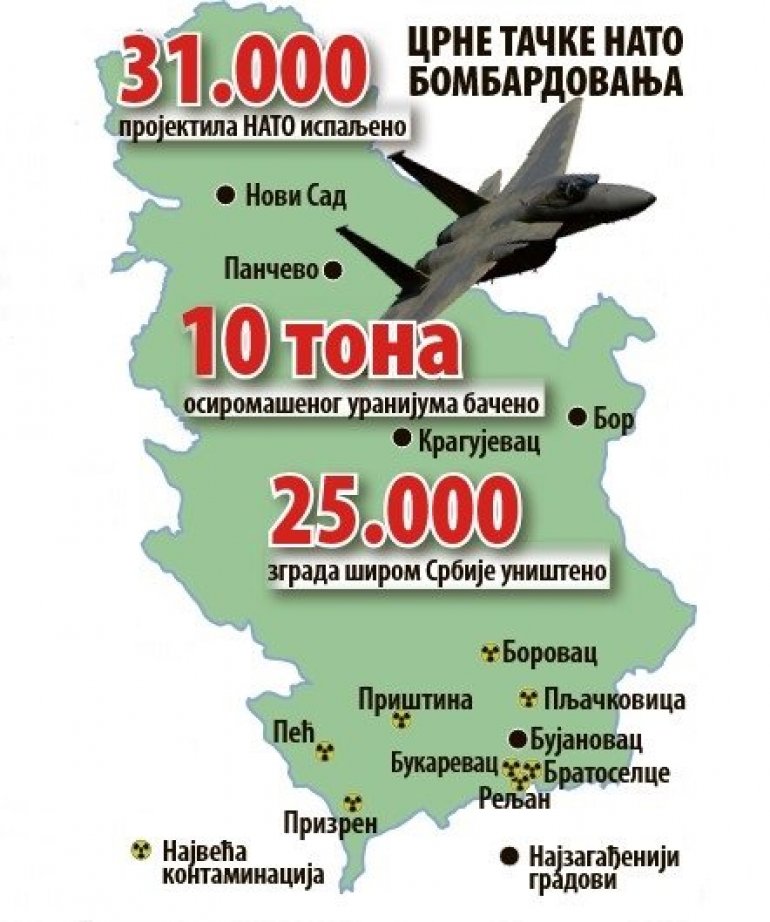 - НАТО је просуо по земљи Србији и Балкану око 15 тона ОУ (U-238), што износи 186 гигабекерела (GBq) или 18.600 Bq по једном становнику Србије (укључујући наравно и Космет), а дозвољен садржај у литру воде за пиће је 80 Bq. Време полураспада U-238 је око 4,5 милијарди година. Контаминација ће трајати дуже но што је до сада трајала људска цивилизација, а при дезинтеграцији U-238 ослобађа алфа и гама зраке прелазећи у 14 потомака. Сви су радиоактивни сем последњег (изотоп олова Pb-206) - писали су стручњаци лани за "Новости".