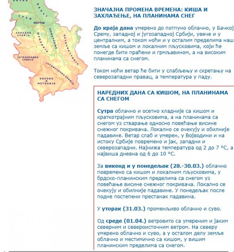 За викенд и у понедељак (28.-30.03.) облачно повремено са кишом и локалним пљусковима, у брдско-планинским пределима са снегом уз повећање висине снежног покривача. Локално се очекују и обилније падавине. У понедељак после подне постепени престанак падавина.