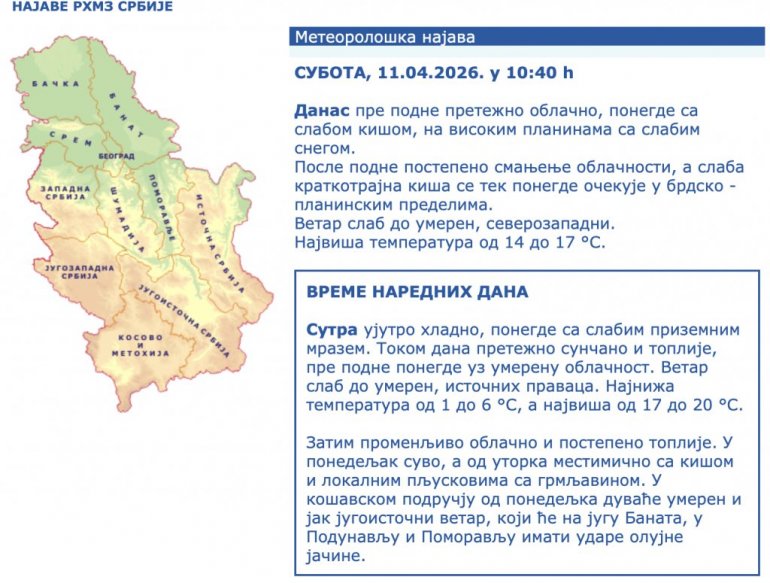 ПОСЛЕ подне постепено смањење облачности, а слаба краткотрајна киша се тек понегде очекује у брдско - планинским пределима., стоји у најновијој објави РХМЗ.