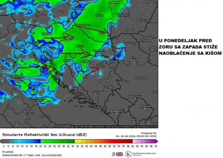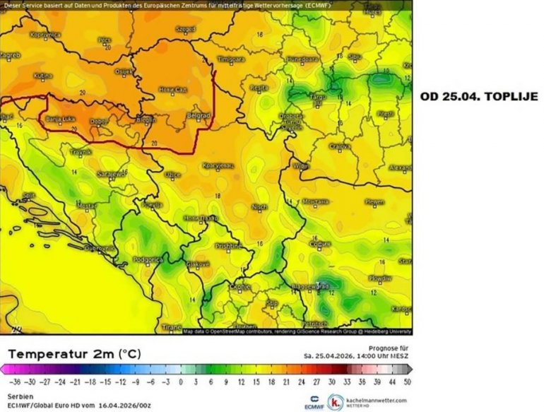 Ипак, Ристић скреће пажњу на датум око 20. априла, када ка нама креће северозападни фронт који ће донети више кише, али Ристић напомиње да то неће бити "прљава" киша са песком. Уз јаче наоблачење, температуре ће пасти на 5, 10 и 15 степени, а на Копаонику се може очекивати и по која пахуља снега.