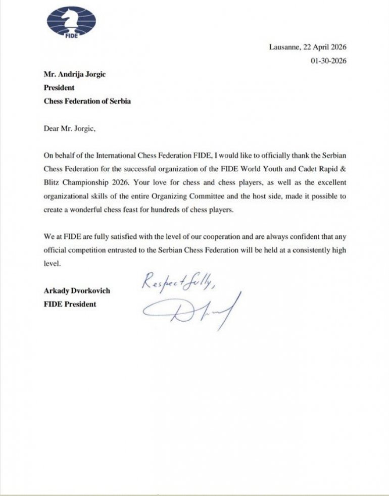 Светска шаховска федерација: Захваљујемо Шаховском савезу Србије на успешно организованом ФИДЕ првенству у Врњачкој Бањи