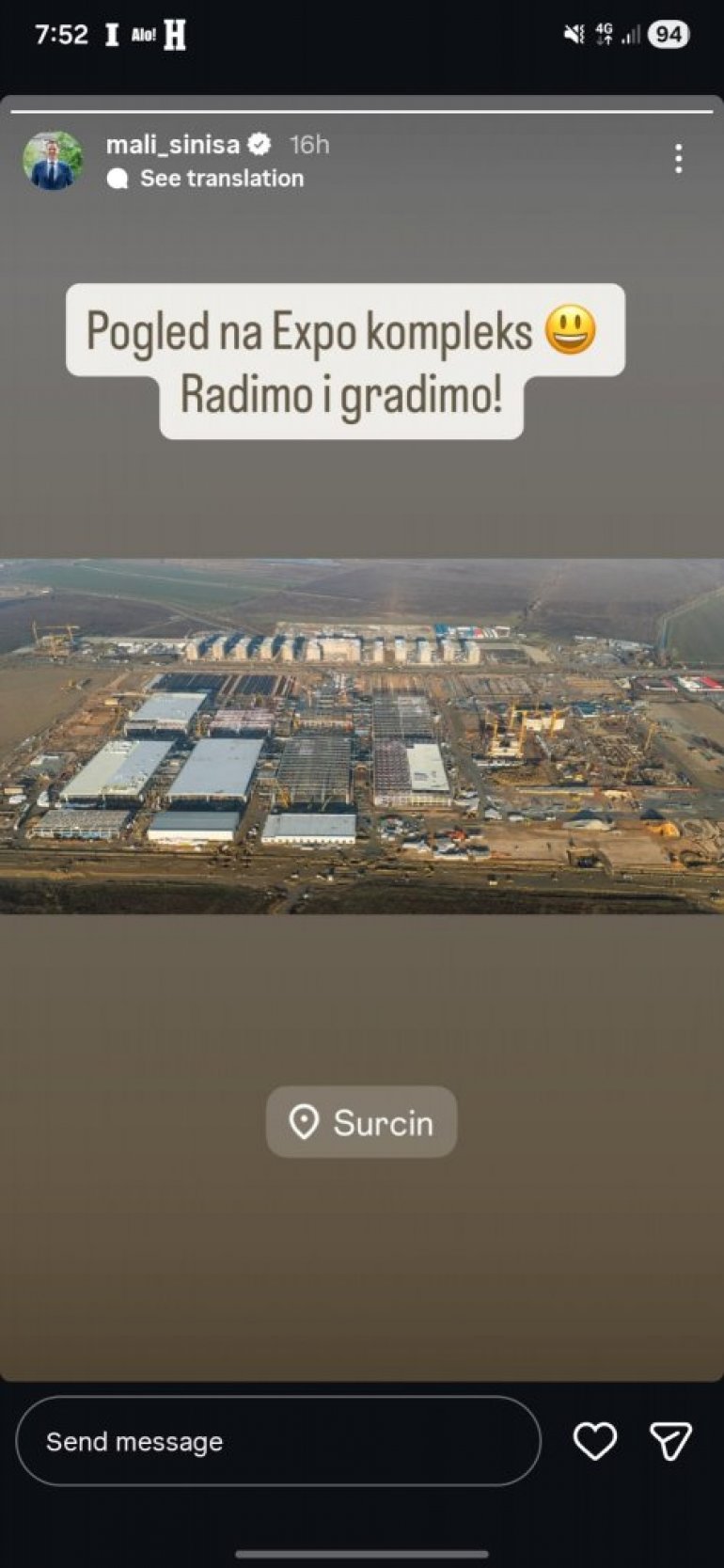 МИНИСТАР финансија Синиша Мали на свом Инстаграм профилу објавио је фотографију на којој се може видети како комплекс Експа у Сурчину, који је у изградњи, изгледа из ваздуха.