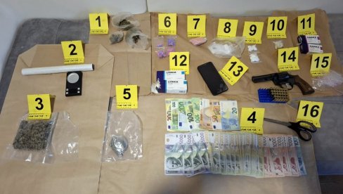 Претресом стана и других просторија на Палилули, које користи осумњичени, полиција је пронашла одређену количину више врста опојних дрога - кокаин, МДМА, марихуану ... као и пиштољ, 33 комада муниције и новац.