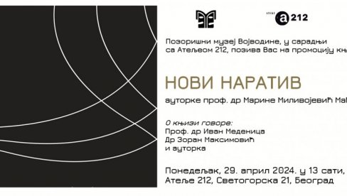 У САРАДЊИ са Позоришног музеја Војводине и Атељеа 212, у овом театру ће у понедељак, 29.априла, бити представљена књига "Нови наратив" проф.др Марије Миливојевић Мађарев.