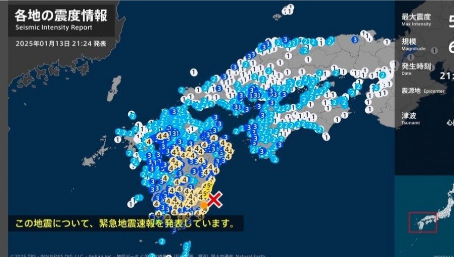 Око 21.19 сати у префектури Мијазаки дошло је до јаког земљотреса са максималним сеизмичким интензитетом нижим од 5.
