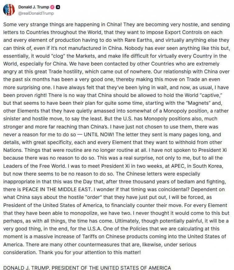 Према његовим речима, Кина покушава да наметне контролу извоза ретких земних метала и других кључних материјала, за које Трамп тврди да нарушава глобална тржишта.