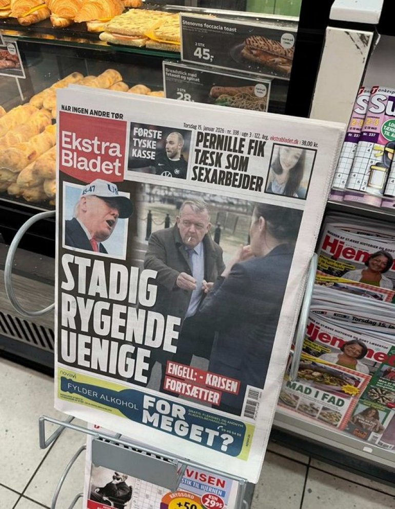Уз фотографију на којој се виде видно напети министри спољних послова Данске и Гренланда, "Екстра Бладет" на насловној страни истиче да се стране "стално не слажу", уз поруку да се криза наставља.