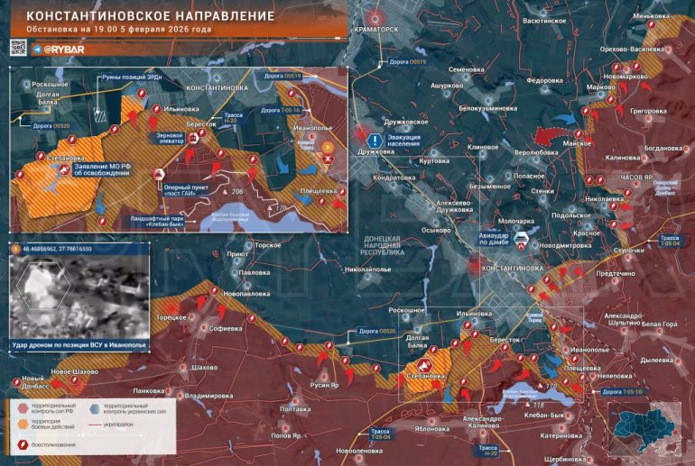 У самој Костантиновки још увек нису примећене промене ситуације. Руске трупе су учврстиле своје положаје на југоисточној периферији града и настављају да испитују одбрану ВСУ са севера. Напад на град је отежан недостатком поузданих прилаза са југа, али изгледа да је управо то оно на чему тренутно ради групација снага „Југ“. Северни бок остаје статичан.
