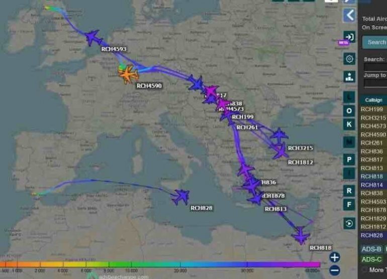 Истовремено, подаци са система за праћење ваздушног саобраћаја показују појачан промет војних транспортних авиона. Летови са позивним ознакама РЦХ у великом броју прелазе преко јужне Европе, Балкана и Турске ка базама у Персијском заливу. Неки од њих, према доступним подацима, усмерени су ка Саудијској Арабији. Интензитет и обим ових премештања указују на логистичку операцију која превазилази уобичајене ротације снага.