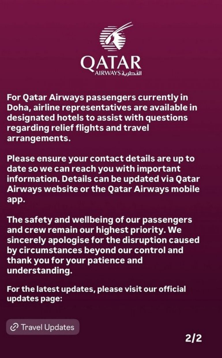 КАТАР Ервејс се огласио поводом тренутне ситуације у региону и привремених затварања ваздушног простора, најављујући организацију специјалних летова.