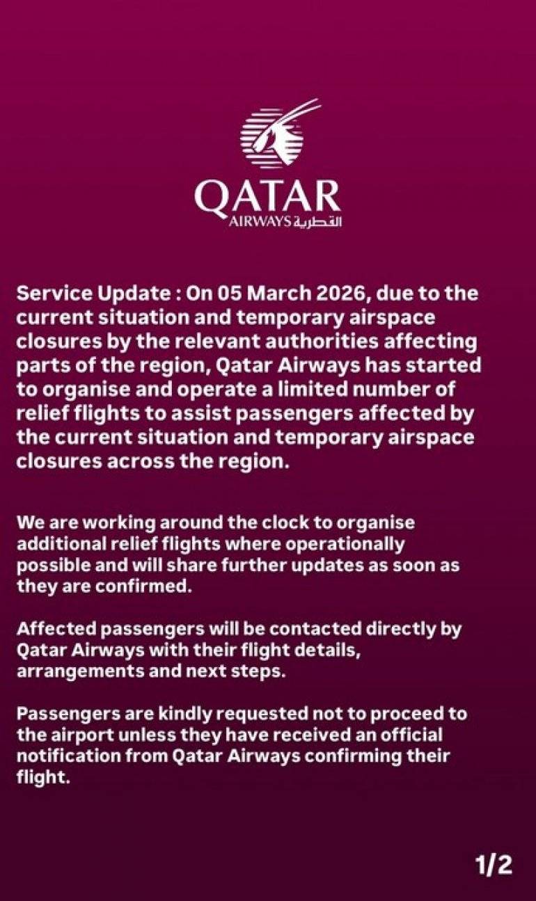 - Дана 5. марта 2026. године, због тренутне ситуације и привремених затварања ваздушног простора од стране надлежних органа која утичу на делове региона, Qatar Airways је започео организацију и обављање ограниченог броја специјалних летова како би помогао путницима погођеним овом ситуацијом. Радимо непрекидно на организацији додатних летова тамо где је то могуће и објавићемо нове информације чим буду потврђене.