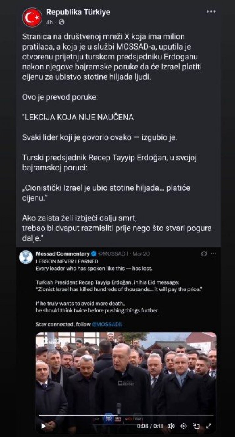 На друштвеној мрежи Икс, која има милион пратилаца, а која је у служби МОССАД-а упутила је отворену претњу турском председнику Ердогану, након његове бајрамске поруке да ће Израел платити цену за убијање на хиљаде људи.