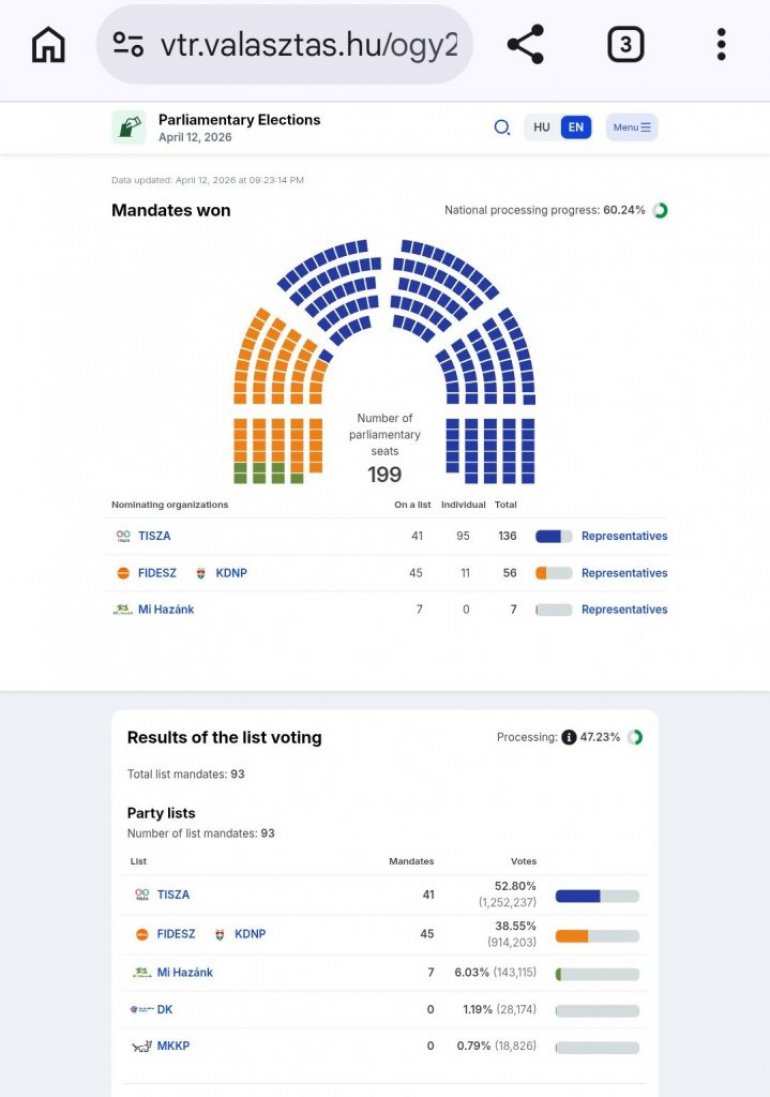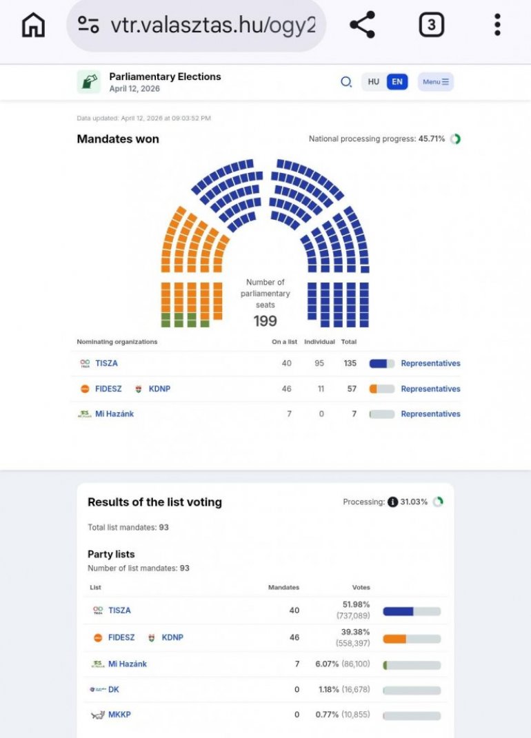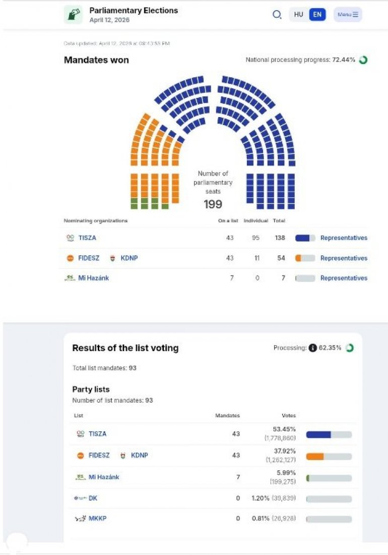На основу 45,71% одсто пребројаних гласова опозициона странка Тиса освојила је 135 мандата (40 са листа, 95 појединачно), док је владајући Фидес добио 57 мандата (46 са листа, 11 појединачно) у мађарском парламенту, наведено је на сајту Националне изборне комисије Мађарске.