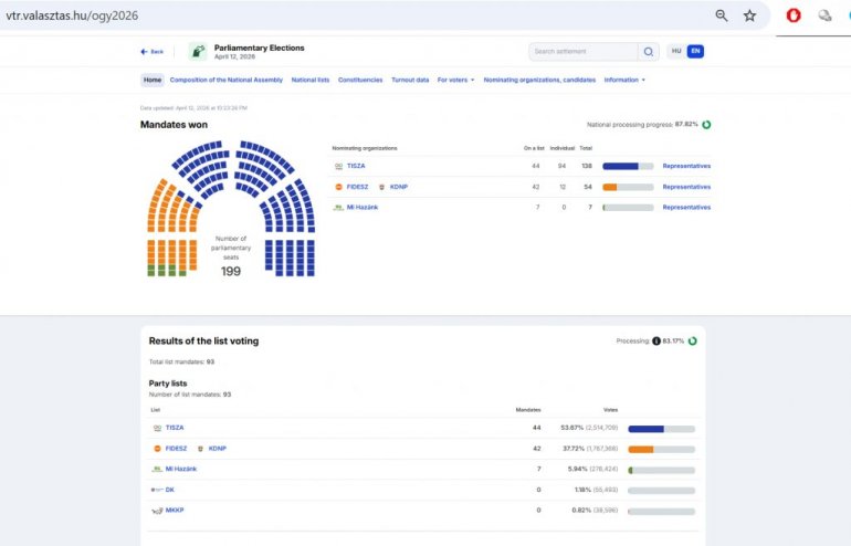 На сајту Националне изборне канцеларије objavljeni су први бројеви, на основу којих Фидес-КДНП води на националној листи са 1,37 одсто гласова, Тиса странка је друга, док је Ми Хазанк на трећем месту, и даље у конкуренцији.