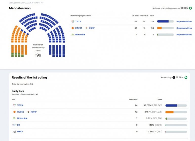 На основу 87,82% одсто пребројаних гласова опозициона странка Тиса освојила је 138 мандата (44 са листа, 94 појединачно), док је владајући Фидес добио 54 мандата (42 са листа, 12 појединачно) у мађарском парламенту, наведено је на сајту Националне изборне комисије Мађарске.