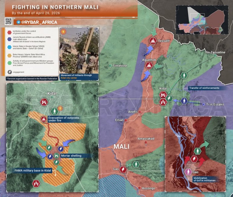 Како је данас објављено, руске трупе Афричког корпуса одбиле су четири масовна напада на камп у Кидалу.