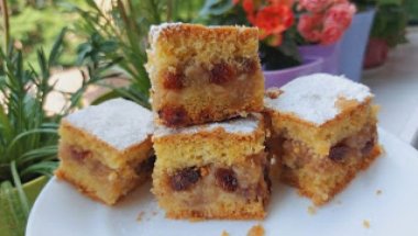 Прекрити остатком теста и поравнати. Пећи на 200 степени 50 - 60 мин. Пред крај покрити. Посути прах шећером са ванилин шећером Сећи охлађен.