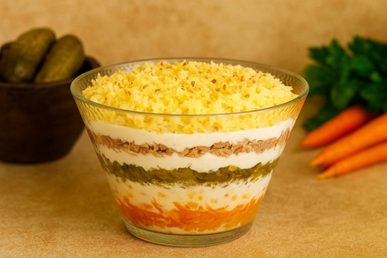 Међу салатама најчешће су руска и мимоза, а за додатни укус можете припремити купус салату или печене паприке.