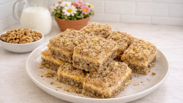 Умутите 150 гр путера са 80 гр  шећера док не постане пенасто. Додајте брашно и 150 гр млевених ораха и све сједините. Посебно умутите 5 беланаца са преосталих 80 гр шећера, па лагано кашиком умешајте у смесу. Масу равномерно распоредите у плех обложен папиром за печење. Пеците на 180°C око 30 минута.