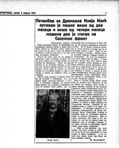 - У десном горњем углу, на отприлике четврт странице, 4. априла 1941, изашао је текст "Печалбар из Дримкола Илија Илић путовао је пешке више од два месеца и више од четири месеца морима док је стигао на Солунски фронт", а аутор је М. (Милисав) Антонијевић - каже Илић. - Одштампао сам га и показао оцу. Узео је текст, а суза сузу је стизала. У том тренутку, схватио сам колико му је то било важно. Колико је мени важно.