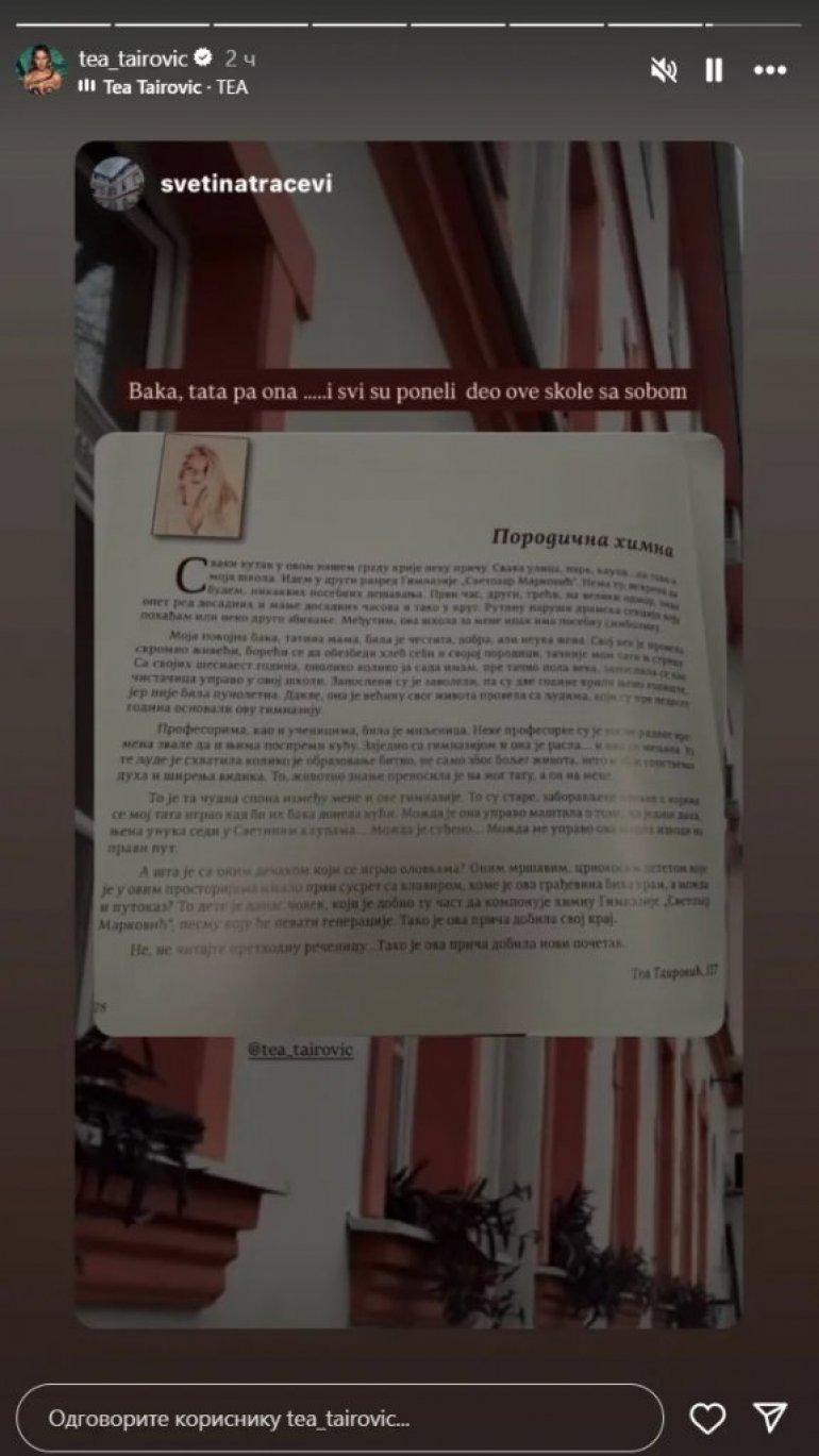 ЈЕДНА од најпопуларнијих музичких звезда млађе генерације Теа Таировић поделила је емотивни исечак из монографије Гимназије "Светозар Марковић", школе коју је похађала.