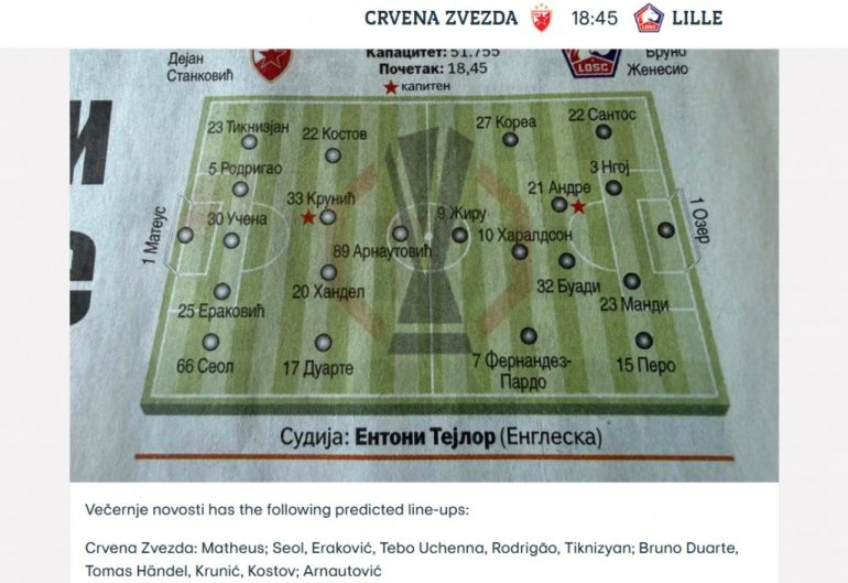 17.44 - УЕФА цитирала Новости. А како и не би, када је у данашњем издању "Вечерњих новости" могао да се види тачно онај тим који је Станковић и изабрао за вечерашњи реванш: