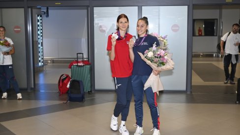 ПОВРАТАК сребрних краљица. Са осмехом од ува до ува и златним сјајем у очима, јуче су две херионе наше "краљице спортова", Ангелина Топић и Адриана Вилагош, измамиле велике аплаузе свих присутиних на долазном терминалу Аеродрома "Никола Тесла".