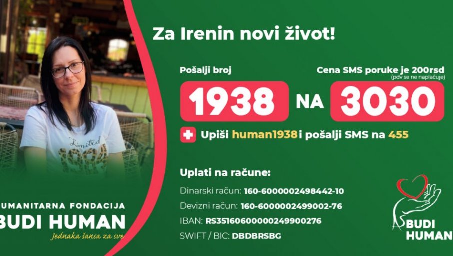 Преко Хуманитарне фондације „Буди хуман“ Ирени се може финансијски помоћи слањем СМС са бројем 1938 на 3030, као и уплатом на рачуне: динарски 160-6000002498442-10 и девизни:160-6000002499002-76. IBAN:RS35160600000249900276 ,SWIFT/BIC: DBDBRSBG.