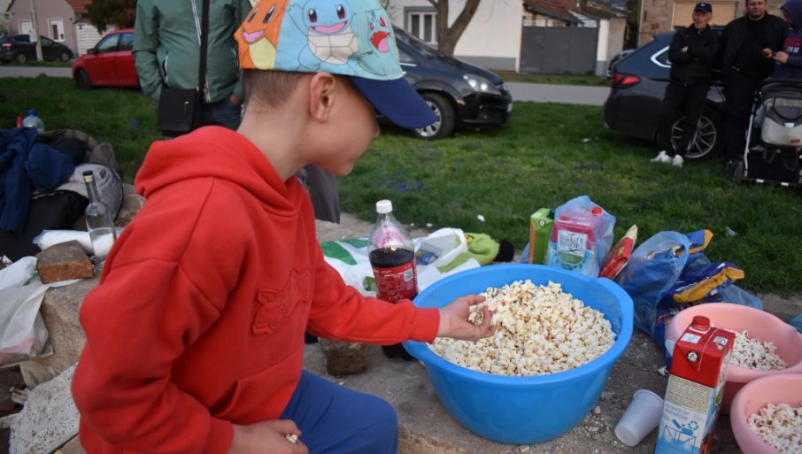 Осим паљења ватре, старији деци обавезно припреме кокице, крофне, сокове и друго послужење. Баш тако је било у Његошевој 62, код породице Радојчин, који више од две деценије окупљају децу из комшилука. Дечаци и девојчице су весело прескакали ватру, одраслији самостално, а најмлађи уз помоћ родитеља, који их држећи за руке, пренесу преко пламена.