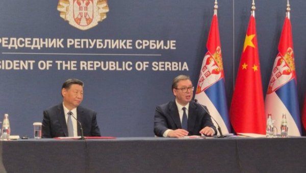 - Мени је данас припала огроман част да будем домаћин председнику Сију. Срећан сам да председник Си два пута у осам година долази у посету нашој земљи. Много тога смо могли да научимо од председника Сија, да чујемо. Председник Си каже да срећа не пада из ведра неба. Ми јесмо заиста напорно радили на развоју наших односа. У 2021, 22, 23. Кина је наш највећи инвеститор, извоз нам је порастао 140 пута у последњих 10 година, наша трговинска размена увећана је осам пута. Ми смо потписали заједничку изјаву, та изјава је стратешки важан правац. Прелазимо из стратешких односа на заједницу која говори о заједничкој будућности. Ми имамо огромно поштовање према Кини. Ми подржавамо принцип једне Кине. Увек ће имати подршку Србије. Захвалан сам председнику Сију по питању КиМ и територијалног интегритета Србије. Имамо срећу да смо у Кини увек имали пријатеља. Рекао сам Сију да ће се Србија снажно одупирати притисцима - рекао је Вучић.