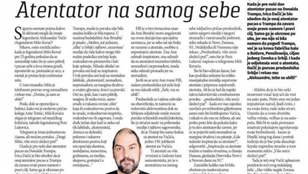 Колумна носи наслов "Атентатор на самог себе", што се односи на Вучића, а у којој је Петровић прво говорио о Мишу Ковачу који је покушао да се убије.