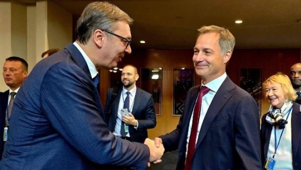 ПРЕДСЕДНИК Србије Александар Вучић са председником Владе Краљевине Белгије Александром де Кроом пред почетак Самита о будућности у Њујорку.