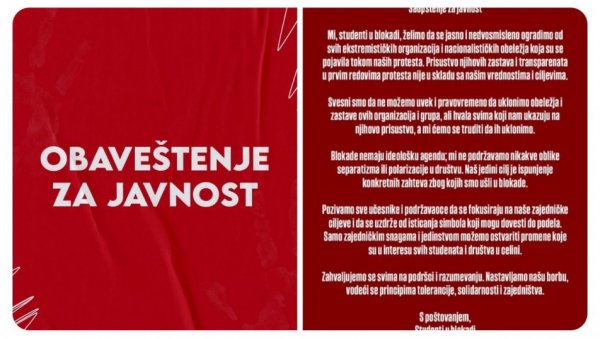 ОРГАНИЗАТОРИ студентских блокада забранили су патриотска обележја на протестима, блокадама и скуповима које организују.