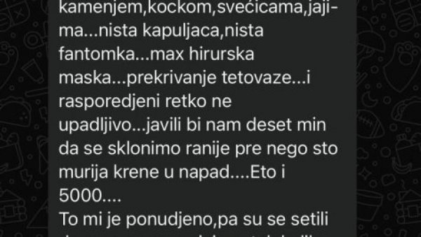 - Ако имаш икакав контакт међу студентима пробај да им јавиш ово...Ја лично сам позван да провоцирам полицију 15ог, гађам камењем, коцком, свећицама, јајима..ништа капуљача, ништа фантомка... макс хируршка маска..прекривање тетоваже..и распоређени ретко неупадљиво..јавили би нам десет мин да се склонимо раније него што мурија крене у напад...Ето и 5000...