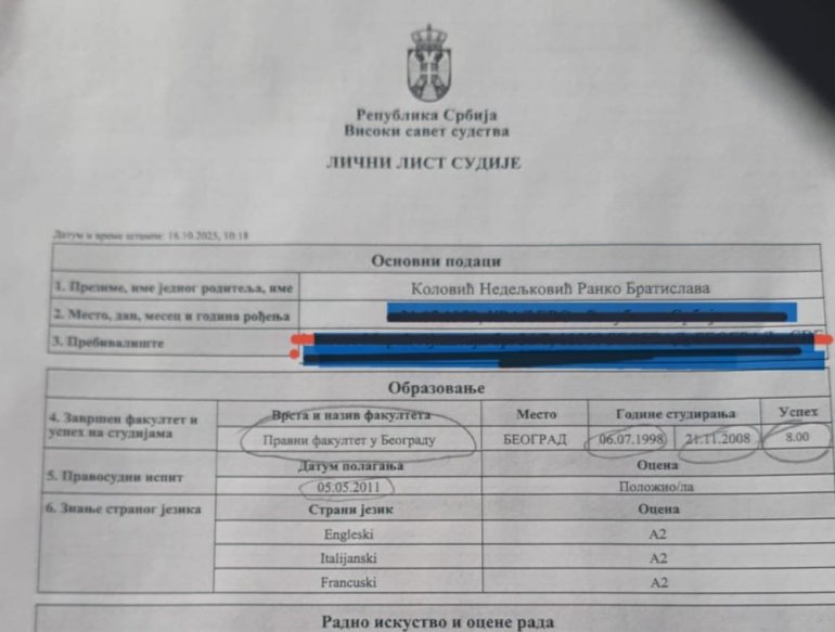 НАКОН скандалозног сазнања да кандидаткиња за члана Високог савета судства, једног од највиших правних институција у држави, Братислава Коловић Недељковић, судија Првог основног суда у Београду, од образовања има приватни правни факултет који у време њеног дипломирања није чак ни имао акредитацију, уследио је невероватан наставак.