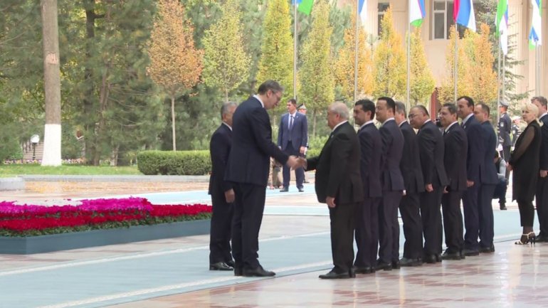 Председник Узбекистана Шавкат Мирзијојев дочекао је данас председника Србије Александра Вучића у државној резиденцији "Куксарој", уз свечани дочек, војне почасти, смотру почасног строја и интонирање химни две земље.