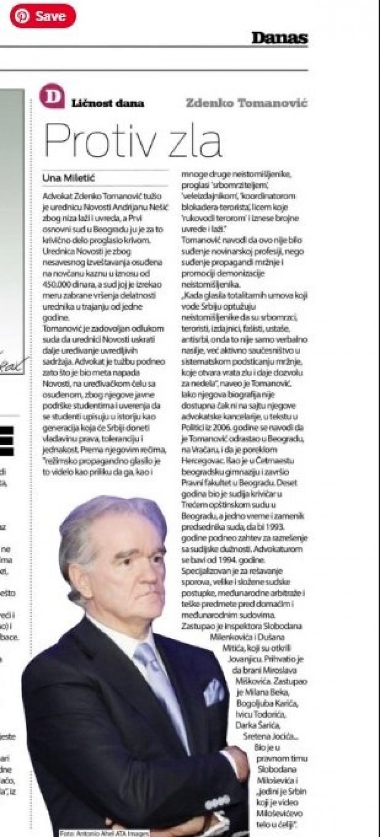 Управо овако представљен је Томановић у Данасу, а текст о срамној предуси Андријани Нешић и његовим заслугама за то, објављен је под још срамнијим насловом "Против зла"!