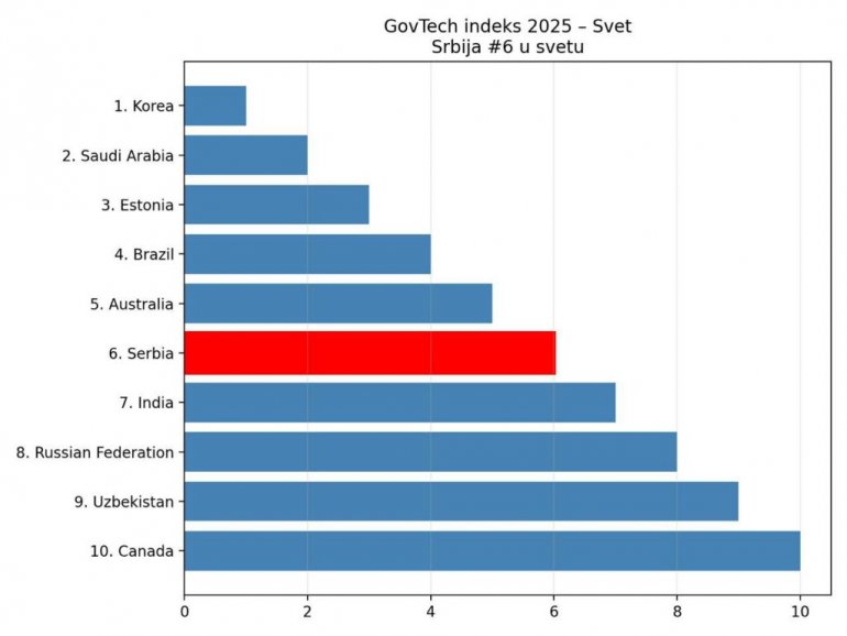Изашао нови ГовТецх Матуритy Индеx - индекс технолошке зрелости јавне управе (ГовТецх Матуритy Индеx – ГТМИ) који се од 2020. године објављује у истоименом извештају Светске банке, уз пратећи сет података. У овогодишњем извештају Србија је додатно напредовала и позиционирана је на другом месту у Европи и 6. у свету. Испред Србије су Кореја, Саудијска Арабија, Естонија, Бразил и Аустралија! У претходном извештају 2022. године, Србија је према вредности ГТМИ индекса била позиционирана на 4. месту у Европи и 11. на свету.