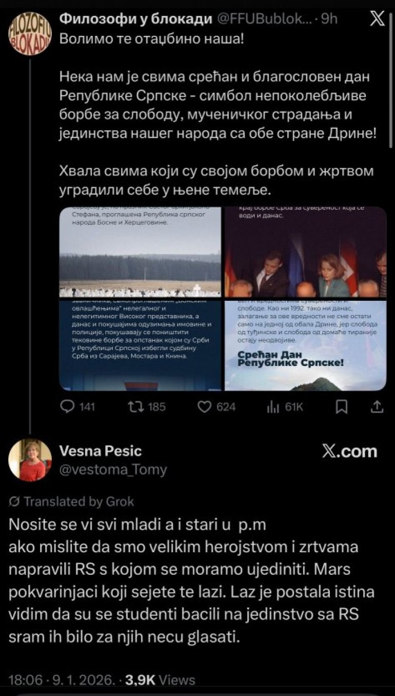 Наиме, позната србомрзитељка, такође блокадерка, Весна Пешић ударила је данас на студенте блокадере због честитања рођендана Републици Српској.