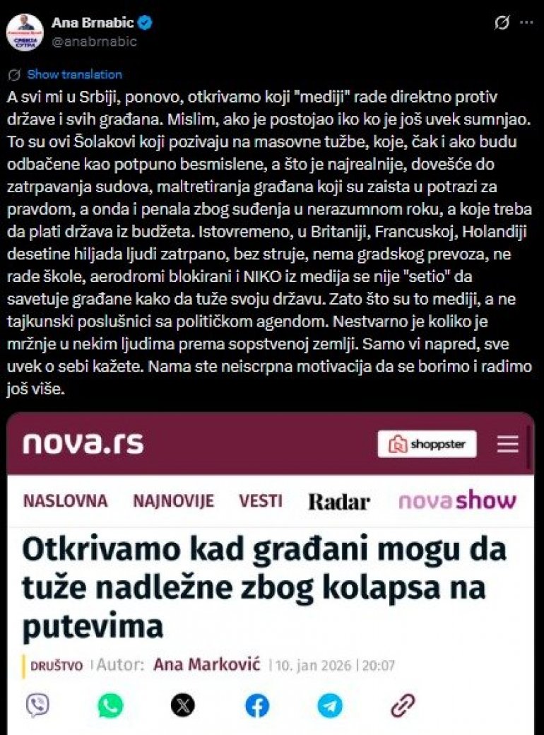 - А сви ми у Србији, поново, откривамо који "медији" раде директно против државе и свих грађана. Мислим, ако је постојао ико ко је још увек сумњао. То су ови Шолакови који позивају на масовне тужбе, које, чак и ако буду одбачене као потпуно бесмислене, а што је најреалније, довешће до затрпавања судова, малтретирања грађана који су заиста у потрази за правдом, а онда и пенала због суђења у неразумном року, а које треба да плати држава из буџета. Истовремено, у Британији, Француској, Холандији десетине хиљада људи затрпано, без струје, нема градског превоза, не раде школе, аеродроми блокирани и НИКО из медија се није "сетио" да саветује грађане како да туже своју државу. Зато што су то медији, а не тајкунски послушници са политичком агендом. Нестварно је колико је мржње у неким људима према сопственој земљи. Само ви напред, све увек о себи кажете. Нама сте неисцрпна мотивација да се боримо и радимо још више - рекла је Брнабић.