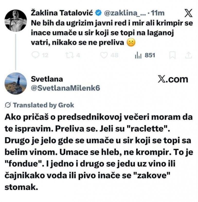 – Не бих да угрозим јавни ред и мир, али кромпир се иначе умаче у сир који се топи на лаганој ватри, никако се не прелива – написала је Таталовић.